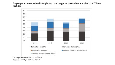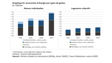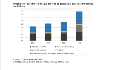 Sur le chapitre des travaux et des gains énergétiques, on constate que « parmi les 2,3 millions de rénovations ayant engendré des gains énergétiques dans les maisons individuelles en 2019, les systèmes de chauffage et/ou d’eau chaude sanitaire constituent presque la moitié des économies d’énergie (49 %), tandis que les rénovations des parois opaques (toitures, murs, planchers) totalisent 38 % des économies d’énergie et celles des parois vitrées et ouvertures 5 % ». Si l’on restreint l’analyse aux travaux aidés, deux catégories sont en nettes hausses entre 2016 et 2019 : les changements de système de chauffage ou d’eau chaude sanitaire qui passent de 47 % des économies d’énergie en 2016, à 55 % en 2019) et surtout des travaux sur les parois opaques 27 % en 2016 et 46 % en 2019).