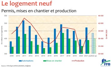 La crise du Covid et tous ses soubresauts (redémarrage de l’économie rapide en Asie et en Amérique qui entraînent des pénuries et difficultés d’approvisionnement) n’en finit pas d’avoir de l’impact sur le monde du bâtiment. Si les chantiers ont rapidement repris en 2020 et si l’activité a rebondi en 2021, tout n’est pas encore revenu à la normale. Olivier Salleron s’est employé à le rappeler lors de la dernière conférence de presse de la Fédération française du bâtiment de l’année : « En volume, l’activité reste inférieure de 5 % par rapport à son niveau de 2019 (dernière année ‘normale’). Dans le détail, compte tenu des délais de production qui s’allongent, le logement neuf ressort à -5,8 % malgré une hausse des ouvertures de chantiers (+0,9 %) avec 390 000 unités ». Un certain raffermissement attribué au report de la RE2020 et à la prolongation des dispositifs existants (PTZ et Pinel).