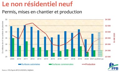 Mais le collectif reste à la traîne avec des permis de construire en baisse de -2,7 % sur deux ans, un phénomène surtout marqué dans les zones tendues où ce recul atteint les -8 %. Pour le non-résidentiel aussi, le rebond constaté n’a pas compensé la chute de 2020 et les surfaces commencées restent à -11,6 %, largement en dessous de la moyenne de longue période. Si certains types de bâtiments restent demandés (industriels et stockage), les bâtiments publics administratifs, les locaux de commerce et les bureaux restent aux abonnés absents. Olivier Salleron poursuit : « Le marché de l’amélioration-entretien a progressé mais reste encore en-deçà du niveau de 2019 (-2,6 %). Mais il y a une belle dynamique grâce à MaPrimeRénov ». Ce secteur est également porté par le nombre très important de transactions dans l’immobilier ancien (1,2 million selon les notaires), ce qui permet d’espérer un regain des chantiers de réhabilitation en 2022.