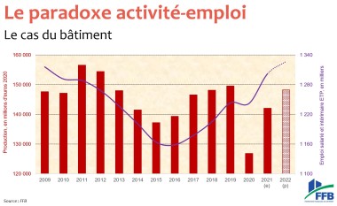 Sur les perspectives justement, la FFB se montre prudente et parle de simple « rattrapage » pour revenir à une activité proche de celle d’avant la pandémie. Ainsi, pour les mises en chantier, la barre des 400 000 pourrait être franchie grâce à un stock très élevé de permis de construire pour des maisons individuelles (déposés avant que la RE2020 n’entre en vigueur). En rénovation, le marché pourrait également continuer de se ressaisir et afficher +2,7 % y compris avec des chantiers en non résidentiel portés par l’Etat qui s’est engagé à remettre à niveau son parc de bâtiments. Au global, l’activité de la construction devrait progresser de +4,3 % avec 25 000 nouveaux postes créés, en plus des 60 000 déjà comptés en 2021. Mais tout cela à plusieurs conditions : « Si les difficultés de recrutement s’amenuisent et si les efforts de formation perdurent ». D’ailleurs, l’écart important constaté entre niveau d’activité pas encore revenu à la normale et le nombre d’emplois en augmentation, s’explique facilement : « Il est lié à la perte de productivité et à la diminution du nombre de travailleurs détachés en lien avec la crise sanitaire », détaille le président de la FFB.
