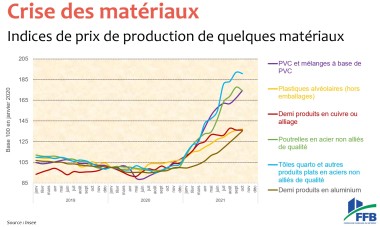 La fédération s’inquiète par ailleurs de la situation financière des entreprises avec l’explosion des coûts des matériaux et matériels qui pèse sur elles depuis le début de 2021. Les hausses constatées peuvent atteindre les +100 % pour le bois, +70 % pour l’acier et +62 % pour les PVC. « Un choc supplémentaire des prix de l’énergie vient s’y ajouter, sur les matériaux qui nécessitent du gaz ou de l’électricité pour être transformés, comme le ciment par exemple », dévoile le responsable. Même sur les matériaux minéraux de construction, les prix auraient gonflé de +5 à +15 %. Avec l’entrée en vigueur de la RE2020 et la mise en place progressive de la REP, la FFB se montre préoccupée du renchérissement des chantiers à venir. Le prix des logements pourrait augmenter de +3,5 à +7 % en 2022 selon l’évolution des cours énergétiques… « Nous travaillons avec les éco-organismes à estimer le prix du recyclage qui pourrait passer de 1-2 % à 5 %. Ce sera très efficace oui, mais plus cher. Et cela sera facturé », explique Olivier Salleron.