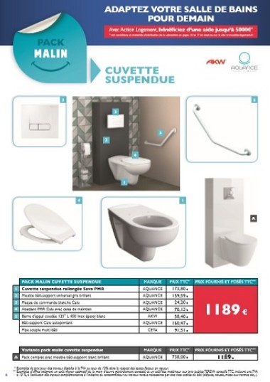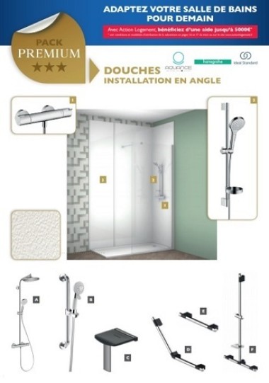 Référençant les équipements de six grandes marques, l’offre qui inclue une TVA à 10 %, met aussi en avant la marque propre de Téréva : Aquance. Chaque pack est détaillé selon les travaux éligibles : produits, caractéristiques, marques, prix fournis-posés. Des options et variantes sont disponibles en complément. Sous conditions de ressources, l’octroi de la subvention doit porter sur « au moins l’une des trois opérations » suivantes : douche avec receveur extra-plat ou solution carrelée, et robinetterie associée ; lavabo pour personne à mobilité réduite ; cuvette de WC rehaussée avec réservoir et barre d’appui ergonomique. Les « travaux complémentaires à l’initiative du client ou ceux rendus nécessaires par des vices cachés du bâti » sont exclus du champ de l’aide d’Action Logement, précise la brochure publiée par Téréva.