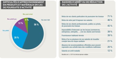 La nature des chantiers et la typologie des donneurs d’ordre sont la principale explication de ces différentes situations. En effet, les trois principales raisons de mise à l’arrêt des chantiers résultent d’abord du refus des clients particuliers (71 %), puis du refus de clients professionnels, publics ou privés (45 %) et enfin de la décision des chefs d’entreprises pour protéger leurs salariés (46 %) en l’absence de recommandations sanitaires officielles, et faute d’équipements de protection en nombre suffisants