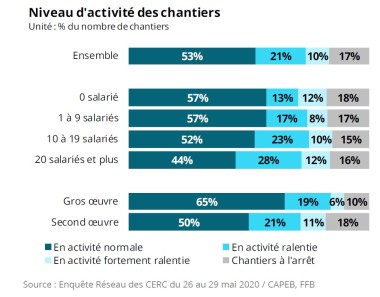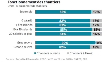 De 53 % le 7 mai, la part des chantiers ayant repris leur activité est passée à 72 % le 15 mai pour finalement parvenir à 83 % lors de cette dernière vague d’enquête arrêtée au 29 mai. Même si tout n’est pas revenu au niveau d’avant cirse, note le Réseau des Cerc, qui pilote cette étude chaque semaine pour le compte de la Capeb et de la FFB, la situation évolue dans le bon sens.
