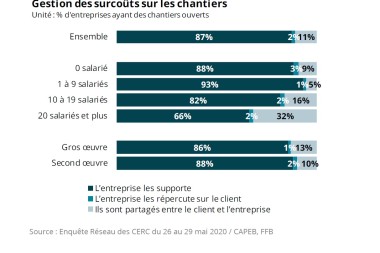 Mais si la reprise est là, certains chantiers sont donc toujours à l’arrêt, en particulier sur les marchés publics qui pèse 43 % des projets bloqués. Parmi les freins encore cités : dans 41 % des cas, la maîtrise d’ouvrage ou maîtrise d’œuvre n’a pas finalisé les conditions de reprise ; 19 % connaissent des problèmes d’approvisionnement en matériaux et/ou fournitures sur les chantiers ; enfin, pour 11 %, l’organisation des chantiers est impossible à adapter. D’autres raisons sont citées, telles que le problème des surcoûts des chantiers (6 %), la gestion des équipements sanitaires (5 %), ou encore des problèmes de personnel au sein de l’entreprise (4 %).