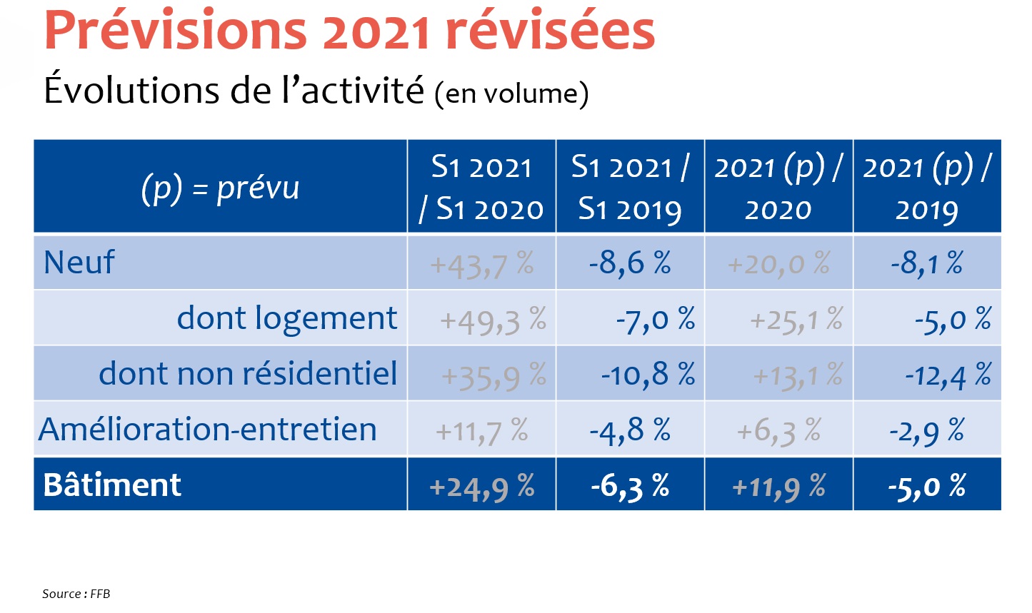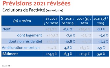 Après une année 2020 très perturbée, ce premier semestre reste difficile à analyser, tout comme l’anticipation des résultats à venir. La FFB a donc revu ses prévisions et table sur -5 % pour l’ensemble du Bâtiment. Il faut toutefois s’attendre à de bien meilleurs chiffres pour le logement tant en neuf qu’en entretien-amélioration sur l’individuel.