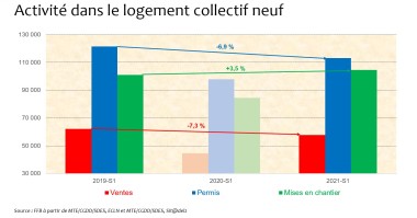 L’activité du Bâtiment recule de 6,3 % sur le premier semestre 2021 comparé à 2019, mais derrière ce résultat global se cachent de forts contrastes. Et c’est finalement plutôt l’optimisme qui domine si l’on considère le seul segment du logement. Sur 7 mois, les mises en chantier et les permis progressent respectivement de 1,8 % et 3,1 % sur la base des résultats 2019. Et là encore la différence est nette pour les autorisations, entre l’individuel à +15,9% et le collectif à -6,1% (-3,4 % sur les trois derniers mois).