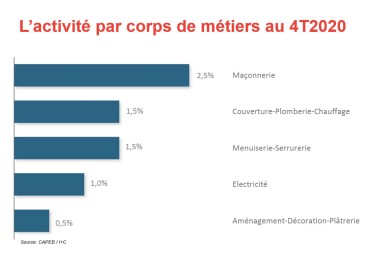 Le bilan de l’année 2020 démontre « l’agilité des petites entreprises qui ont su rebondir » se réjouit Jean-Christophe Repon, le président de la Capeb lors de la présentation des chiffres d’activités. Avec une croissance de +1,5 % sur le 4ème trimestre, l’année se solde finalement par un recul global de 9% pour les artisans : -8,5% en construction neuve et -9,1% en rénovation. Les effets du Plan de relance ne sont pas encore directs, toutefois, estime le président, les mesures mises en place ont sans doute contribué à restaurer une certaine confiance chez les particuliers pour lancer des projets mais aussi pour laisser leurs portes ouvertes aux chantiers lors du deuxième confinement.