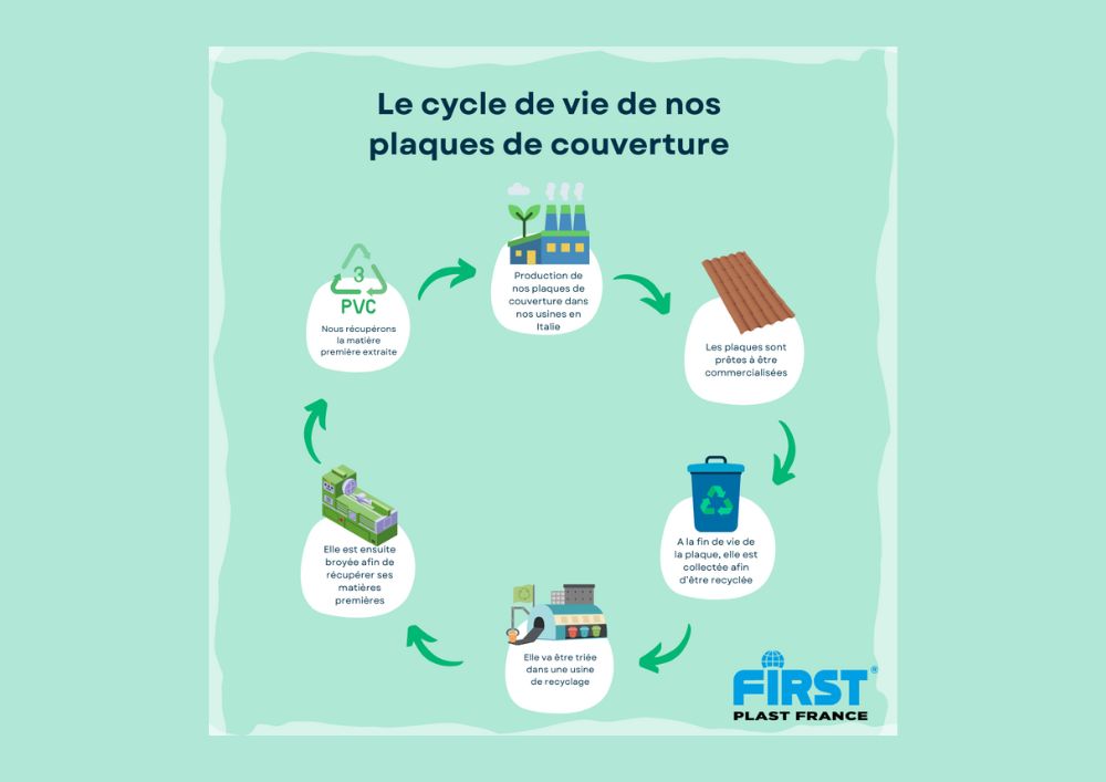 Une infographie vaut mille mots. Voici le cycle de vie des plaques de couverture Cover-Life de First Plast. Elles sont 100 % recyclables.
