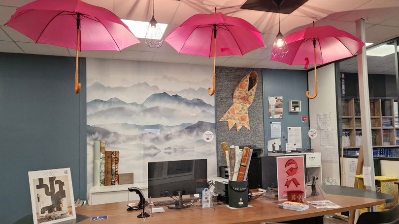 Rayonnant sur le quart Nord-Ouest, chacune de ses quarante-deux agences (enseignes Solmur, Grassin Décors et Midi Carrelage) a pu réaliser des vitrines et corners thématiques et solidaires. « Cette action collective permet d’exprimer la sensibilité déco des enseignes qui sont libres de créer leurs propres scénographies pour mettre à l’honneur cette cause nationale et son célèbre symbole, le Ruban Rose », explique le distributeur indépendant.