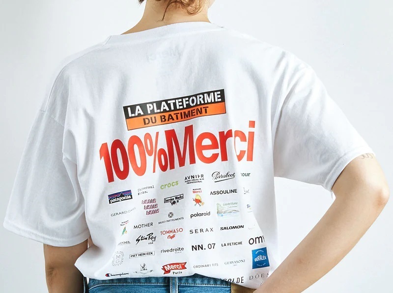Sur son site marchand, Merci précise que « parmi ses labels fétiches, on retrouve des marques de prêt-à-porter telles que Patagonia, Barbour, Mother, Sea New York ou Mira Mikati, les céramistes Jars et Marion Graux, le designer Piet Hein Eek ou encore des clins d’œil à des collaborations, à l’instar du Tommaso Café ou de Madame Merci ».