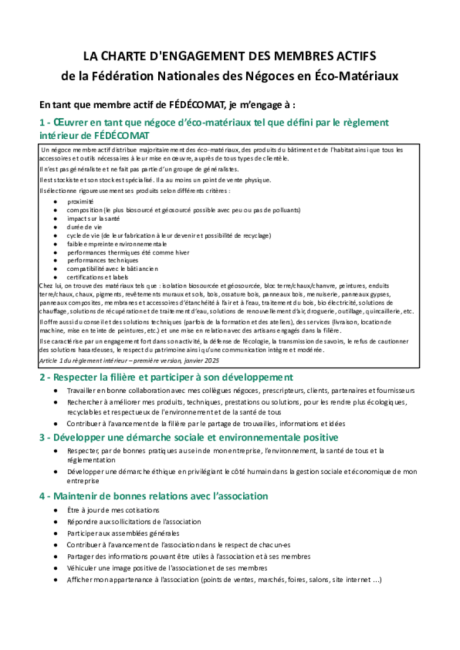 Selon l’article I de la charte d’engagement de la Fédécomat, « un négoce membre actif distribue majoritairement des écomatériaux […]. Il n’est pas généraliste et ne fait pas partie d’un groupe de généralistes […]. Son stock est spécialisé. »