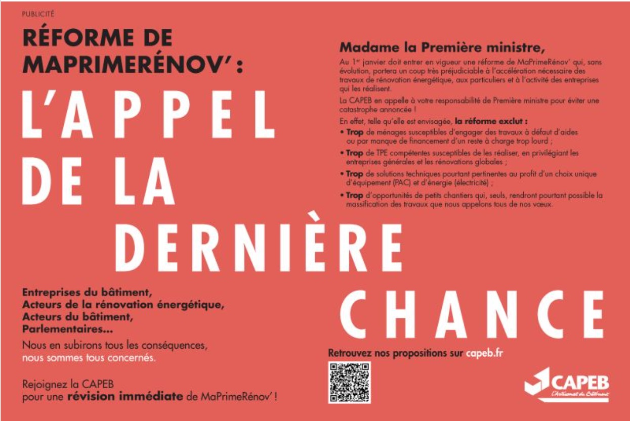 « Un appel de la dernière chance », pas moins ! La Capeb ne fait pas dans la nuance pour interpeller les pouvoirs publics et appeler à une large cohésion de la filière contre la réforme de MaPrimeRénov’ pour 2024.