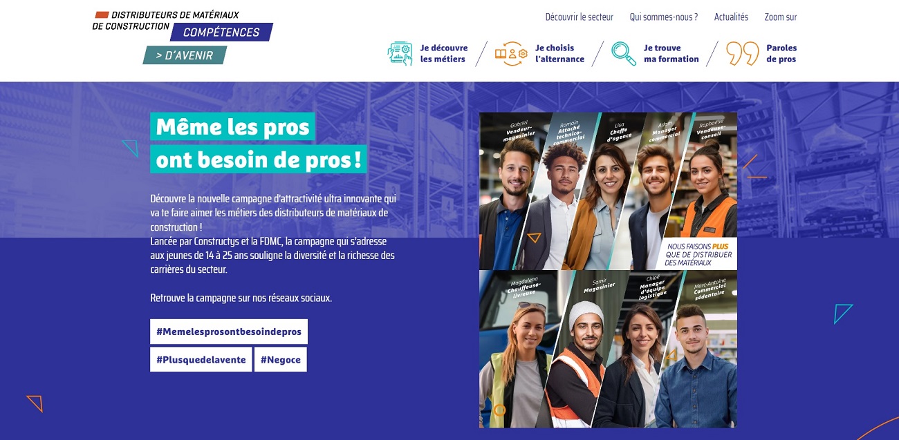 L’initiative – pilotée par la FDMC et Constructys – s’appuie sur une large palette de relais pour capter prioritairement les jeunes, mais aussi les femmes et les personnes en reconversion professionnelle. La nouvelle accroche “Même les pros ont besoin de pros, nous faisons plus que de distribuer des matériaux” renvoie à la diversité des métiers, mais également des missions de la distribution face aux défis environnementaux et sociétaux.