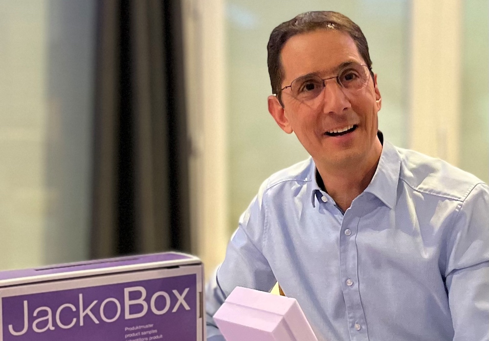 Benoît avec la maquette du système Atlas pour radiers de JACKODUR