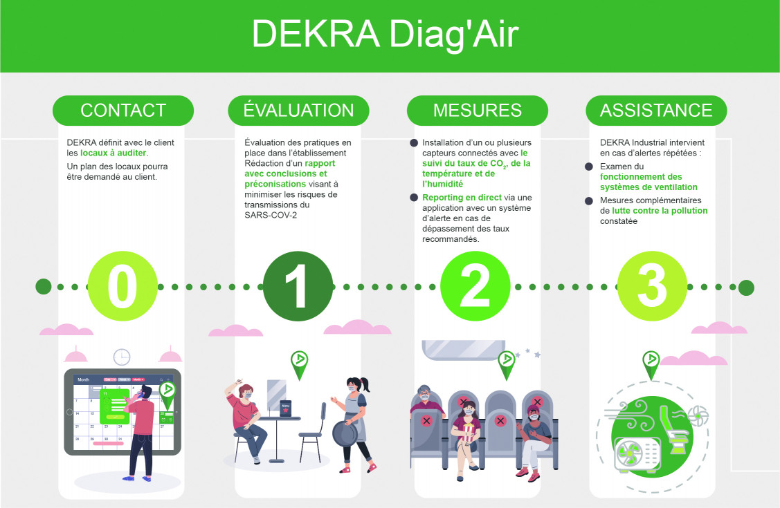 Dekra Industrial, l'un des plus grands organismes d’expertise au monde, s’associe à Cozy Air, spécialiste des capteurs connectés pour la qualité de l’air, pour lancer une nouvelle solution d’accompagnement global, Dekra Diag'Air, pour les établissements recevant du public (ERP). La démarche suit un protocole en trois temps : évaluation des pratiques en place dans l’établissement et rédaction d’un rapport avec conclusions et préconisations visant à minimiser les risques de transmission du SARS-COV-2 ; installation d’un ou plusieurs capteurs connectés Cozy Air avec suivi du taux de CO2, de la température et de l’humidité ; indication en temps réel des niveaux de concentration, avec système d’alerte en cas de dépassement des taux recommandés. Afin de promouvoir l'engagement des ERP, Dekra met également à leur disposition une signalétique dédiée au grand public.