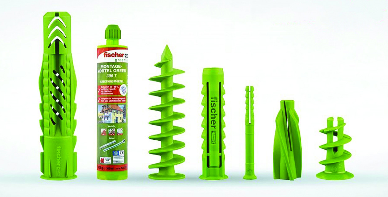 La gamme de chevilles de fixation Greenline de Fischer est la première au monde fabriquée à base de matières premières renouvelables, en proportion de 50 à 80 %, notamment de l’huile de ricin utilisée comme matériau de base pour le polyamide. Elle se compose de 7 familles de produits qui permettent de réaliser de multiples applications dans de nombreux matériaux de construction : la cheville universelle UX Green, la cheville à expansion SX Green, la cheville pour plaques de plâtre GK Green, la cheville à frapper N Green, la fixation dans matériaux isolants FID Green, la cheville pour béton cellulaire GB Green et enfin la résine d’injection chimique tous matériaux FIS Green 300 T, parfaitement adaptée à la fixation de charges lourdes dans différents matériaux. Quant aux emballages, ils sont fabriqués avec 90 % de papier recyclé.