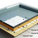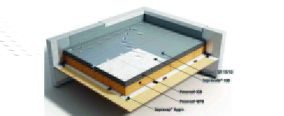 Pour l’isolation thermique sous étanchéité destiné aux toitures terrasses, Soprema a conçu Pavaroof, seul système du marché à associer deux panneaux isolants rigides biosourcés, l’un en fibre de bois et l’autre en liège. Valorisable pour un bâtiment bas carbone, cette solution bénéficiant d’une Atex convient en climat de plaine sur des ouvrages individuels, collectifs ou sur des établissements recevant du public, le complexe affichant par ailleurs un classement au feu Broof t3. Les panneaux en liège servent de support entre l’étanchéité PVC et les panneaux en fibre de bois. Intégrant également un pare-vapeur hygrovariable, le système évite le risque de condensation pouvant se former sous l’étanchéité. La fibre de bois du complexe stocke le CO2 et permet aussi d’obtenir les meilleures performances en matière de déphasage thermique.