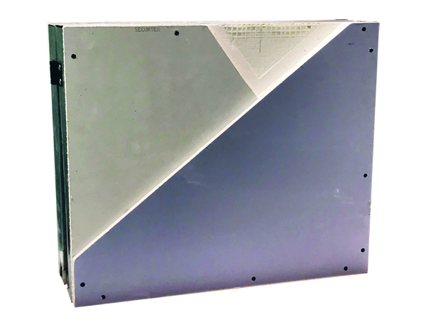 La plaque Securtex® de Siniat intègre des grilles en fibre de verre conçues par le spécialiste du textile industriel Chomarat, associées à du gypse dense. Selon Siniat, il s’agit du premier système composé uniquement de plaques de plâtre accrédité “Secured by Design”, un label de la police anglaise de prévention du crime. Le renfort en fibre de verre dissipe la force sur toute la surface du panneau, offrant ainsi une résistance aux chocs en cas de dommages délibérés ou accidentels, de même qu’aux outils utilisés par les cambrioleurs (tournevis, etc.), éliminant ainsi le besoin de matériaux supplémentaires tels que des plaques métalliques. Elles se pose comme une plaque classique et se découpe au cutter. Dimensions 1 200 x 2 400 x 15 mm. Poids 13,5 kg.