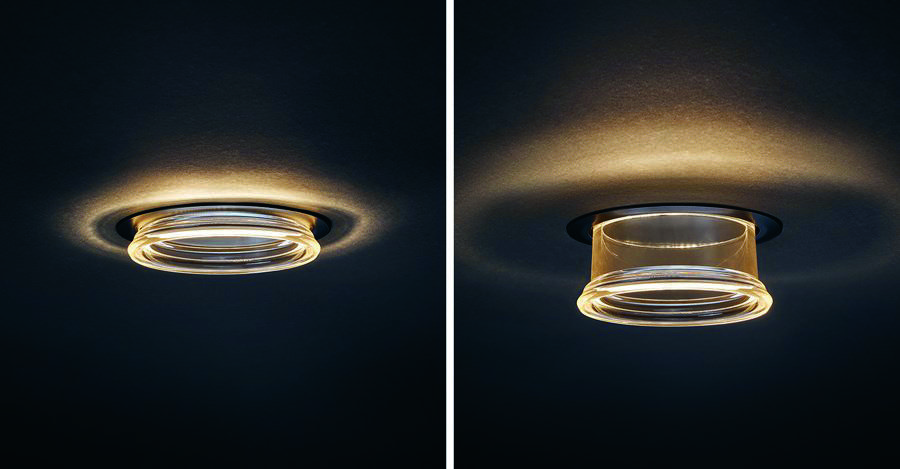 Destinée à la construction neuve et à la rénovation, la solution Concord Equinox se base sur une optique développée par le fabricant américain QuarkStart utilisée initialement sur des luminaires linéaires. Sylvania a décidé d’adapter cette solution à un luminaire circulaire de type downlight grâce à un partenariat exclusif en Europe avec l’entreprise américaine. Selon l’ambiance désirée, deux positions de réglage vertical de l’optique sont proposées : rétractée, l’optique devient plus discrète et dessine au plafond un halo au plus proche du luminaire, ou déployée pour donner l’impression d’être suspendue à quelques centimètres du plafond. Le halo projeté sur celui-ci s’éloigne du luminaire comme une ombre qui renforce cette idée de lévitation. « Une fois le produit installé, le réglage peut se réaliser à la main sans démontage ni besoin d’accéder au fond plafond », souligne Benjamin Chapuis.