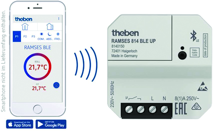 Le thermostat programmable digital Ramses 814 BLE UP de Theben se paramètre et se commande par une application sur smartphone ou tablette, en Bluetooth basse consommation. Ce protocole à moyenne portée ne requiert aucune connexion internet ou cloud. Conçu pour être discret, il se monte en boîtier encastrable (avec toutes les gammes d’appareillage sous obturateur), devenant invisible sous le recouvrement borgne ou le couvercle du boîtier. Un algorithme spécifique tient compte de l'auto-échauffement et de l'inertie des matériaux, pour garantir une saisie précise de la température. Il gère tout type d’appareil de chauffage (plancher chauffant, chauffage de pierre naturelle et de verre, pompe du circuit de chauffage…). Une entrée externe permet le raccordement d’une sonde de température extérieure ou d’un détecteur de présence.