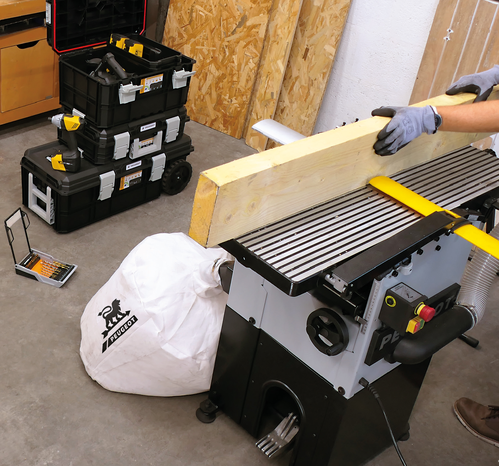 Le deuxième univers sur lequel repose Peugeot Outillage, c’est l’équipement pour les ateliers avec des étaux, enclumes, servantes, supports de scies ou encore la nouvelle gamme de caisses à outils empilables Storage Hub. Fabriquées en Europe, ces caisses à outils sont 100% recyclables et ont été lancées en décembre 2022. Enfin, la marque aux outils jaune et noir s’appuie sur un dernier univers : celui des machines stationnaires équipées du système ASP. « Pour diminuer les contraintes logistiques et les poussières sur le chantier, Peugeot Outillage a imaginé une gamme de machines dotée d’une aspiration intégrée de série. Le produit se retrouve plus compact avec moins de tuyaux et de câbles autour des machines, dans une zone plus sécurisée. La récupération des poussières s’opère soit par une turbine jumelée au moteur, soit par un second moteur dédié à l’aspiration. Les deux principes n’ont qu’un seul but : diminuer au maximum les poussières en suspension dans l’air ambiant. Le système ASP récupère par exemple jusqu’à 97% des copeaux sur notre raboteuse dégauchisseuse », détaille Christophe Hurel.