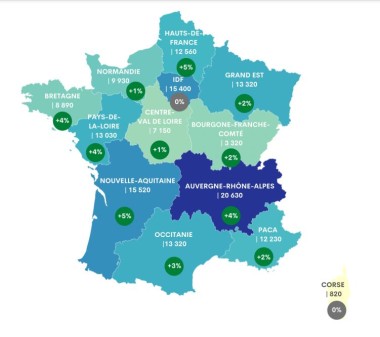 C’est dans les régions Hauts-de-France et Nouvelle-Aquitaine que l’on observe la plus forte progression de l’apprentissage dans l’artisanat (+5 %), suivies par la Bretagne, les Pays-de-la-Loire et l’Auvergne-Rhône-Alpes (+4 %), l’Occitanie (+3 %), la Provence-Alpes-Côte d’Azur, le Grand-Est, la Bourgogne-Franche-Comté (+2 %) et, enfin, le Centre-Val de Loire et la Normandie (+ 1(%).