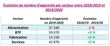 La hausse des effectifs en apprentis concerne également la plupart des secteurs : le BTP (+5 %), les services (+3 %) et la fabrication (+2 %). Seul l’artisanat de l’alimentation, où l’apprentissage est déjà très développé, observe une légère baisse de ses effectifs (-1%).