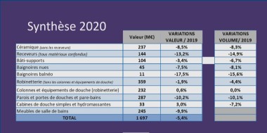 Ainsi, tous les segments sont en baisse, à l'exception de la famille colonnes applique et équipements de douche. Surtout, les réseaux professionnels ont particulièrement souffert de la fermeture des showrooms et des points de vente professionnels en raison des confinements. Le segment douche (receveurs, colonne, équipement de la douche, parfois cabines, thermostatiques) représente d’ailleurs 44% de l’activité de la salle de bains, soit plus de 750 millions d’euros. Derrière, le segment robinetterie et équipement de robinetterie pour la douche, représente un tiers du chiffre d’affaires du secteur avec 520 millions d’euros.