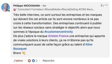 « Très belle interview, ce sont surtout les entreprises et les marques qui doivent lire cet article, car ils sont encore nombreux à ne pas croire à cette transformation. Des entreprises continuent à publier sur les réseaux sociaux sans stratégie ni objectifs alors que nous sommes à l'époque du #customercentricity.