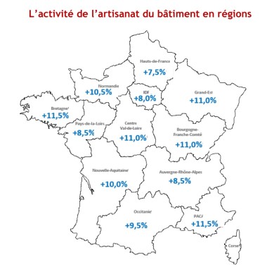 Par corps de métier, la progression du volume d’activité s’scrit dans une fourchette entre 7 et 12 % : l’électricité, la menuiserie-serrurerie et l’aménagement-décoration-plâtrerie se montrent les plus dynamiques avec des hausses comprises entre +10,5 % et +12 %. Pas loin derrière, la maçonnerie et la couverture-plomberie-chauffage enregistrent respectivement à +9 % et +7 %.
