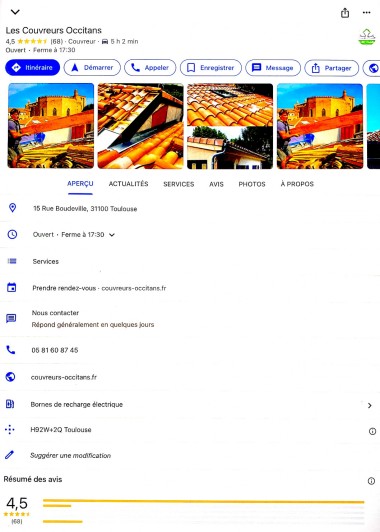 A quoi ressemble une page Google My business ? Voici un bon exemple avec l’entreprise les Couvreurs Occitans :