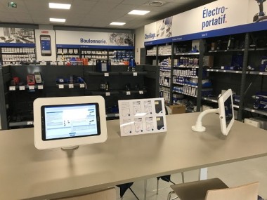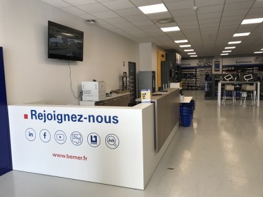 Au cœur de l’agence, l’espace d’accueil dispose d’une large table de travail avec wifi, tablettes et imprimantes : le bureau déporté des artisans. Ce premier point de vente Berner servira aussi d’espace de rencontre pour les clients et les collaborateurs du distributeur avec l’idée d’en faire un centre de ressources (documentations techniques, formations…). Aux abords du comptoir ouvert, un espace propose le SAV, le prêt de matériel sous garantie et la location d’outillage.
