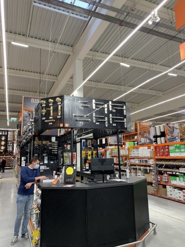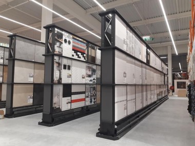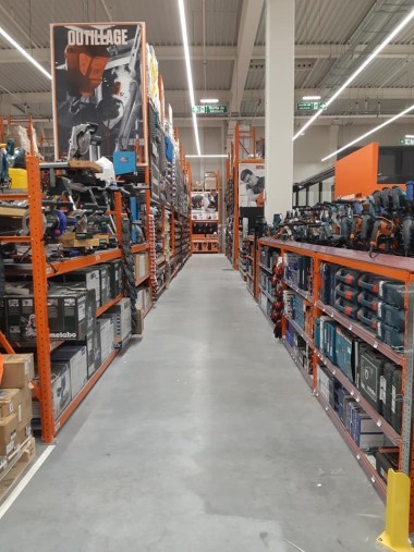 On pénètre alors dans l’allée principale avec une première amélioration notable : la hauteur des racks a été abaissée pour donner au visiteur une visibilité sur l’ensemble du point de vente et lui permettre de mieux s’orienter tout de suite. « Faire gagner du temps et faciliter la vie des artisans » : c’est le leitmotiv de l’enseigne illustrée par de nouveaux aménagements.