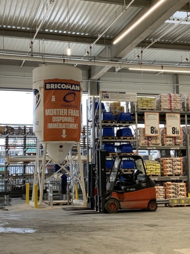 L’enseigne, qui poursuit sa mue vers les professionnels, affirme encore plus fort ici son positionnement. Ouverture dès 6 h 30, mini-centrale à béton bien visible et message sans équivoque indiquant aux pros : “On vous aide à réaliser les projets de vos clients”. Sur ses 9 200 m² de surface, le point de vente peut donc déployer tous les services, piliers de son concept, déjà dévoilés à Châlons-sur-Saône et Metz. On y retrouve le Petit Café du Pro dès l’entrée de la zone chaude, puis, après avoir longé la rangée de caisses, le Lab, l’espace-atelier présenté comme un lieu de formations pour les artisans et étudiants.