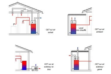 Il conviendra tout d’abord d’étudier en amont le choix typologique de chauffe-eau thermodynamique. On peut distinguer quatre types de CET : l’extraction de calories sur l’air ambiant (dans un local non chauffé), sur air extérieur gainé, sur air extérieur bi-bloc (avec ventilateur à l’extérieur) et enfin sur air extrait (branché sur la VMC). Il faudra scrupuleusement adapter les débits d’air qui ne sont pas les mêmes suivant la solution retenue. « En effet, les débits d’un CET ambiant/gainé sont plus importants que sur un CET type VMC », avance l’AQC. Inutile de préciser qu’il faudra également respecter la conformité du produit par rapport aux prescriptions et à l’usage prévu : contrairement à un CET sur VMC, un CET sur air ambiant ne dispose pas de filtre, et son branchement sur le système de ventilation entraînera une détérioration de l’évaporateur. De plus, la garantie du fabricant ne s’appliquera plus.
