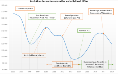 Les raisons de l’enrayement de la croissancePlusieurs facteurs cumulés seraient à l’origine de cette dégradation. La remise en cause brutale des aides au logement, (suppression de l’APL Accession, réduction de moitié de la quotité du PTZ en zones B2 et C et suppression du dispositif Pinel en zone B2), conjugués au fléchissement du moral des ménages malgré les bonnes conditions de crédit.Si le secteur diffus inquiète, la maison individuelle en secteur groupée ne se porte pas beaucoup mieux. « A fin septembre 2018 (derniers chiffres disponibles), les ventes se sont affaissées de 12,9 % sur 12 mois glissants, et s’établissent à 9 534 unités. Au troisième trimestre 2018, les réservations ont même chuté de 21,4 % et les mises en ventes de 29,9 % (par rapport au troisième trimestre 2017) », analyse LCA-FFB. Et pour 2019 ? Le dispositif de mesures en faveur du logement restant à priori inchangé, les prévisions de LCA-FFB tendent vers une relative stabilité du marché de la maison neuve en secteur diffus, soit « un niveau d’activité moyen au regard des quinze dernières années. »En chiffres cela se traduirait par des ventes comprises entre - 3 % et + 3 %, soit entre 116 000 et 123 000 unités, marqué par un premier semestre atone puis un sursaut en fin d’année. Mais prévient LCA-FFB cette reprise serait « trompeuse » car tiré par le « phénomène d’anticipation de la décision d’achat des ménages lié à l’extinction annoncée du PTZ dans les zones B2 et C à compter du 1er janvier 2020. » Une véritable rupture qui pourrait encore renforcer la fracture territoriale ! Dans le même temps, estime le syndicat, rien ne laisse présager d’un retournement positif dans le secteur groupé et le collectif.« Cette situation prouve, s’il en était besoin, que les aides publiques en faveur de l’accession à la propriété ne représentent pas un effet d’aubaine, mais constituent à l’inverse un effet levier positif et essentiel pour le passage à l’acte d’achat des ménages. », conclut le syndicat qui espère que cette fois ses arguments en faveur du maintien du PTZ seront entendus par les pouvoirs publics.