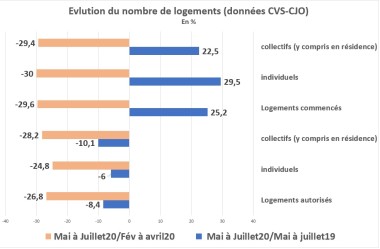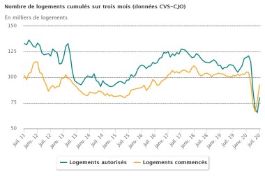 Si le nombre de logements autorisés à la construction est encore inférieur de 28 % à la moyenne des trois mois précédant le confinement (décembre 2019 à février 2020) et de 23 % à la moyenne des douze mois précédant le confinement (mars 2019 à février 2020), en revanche pour les logements commencé, le chiffre se rapproche de ses moyennes d'avant confinement (respectivement - 8 % et - 5 % en juillet 2020).