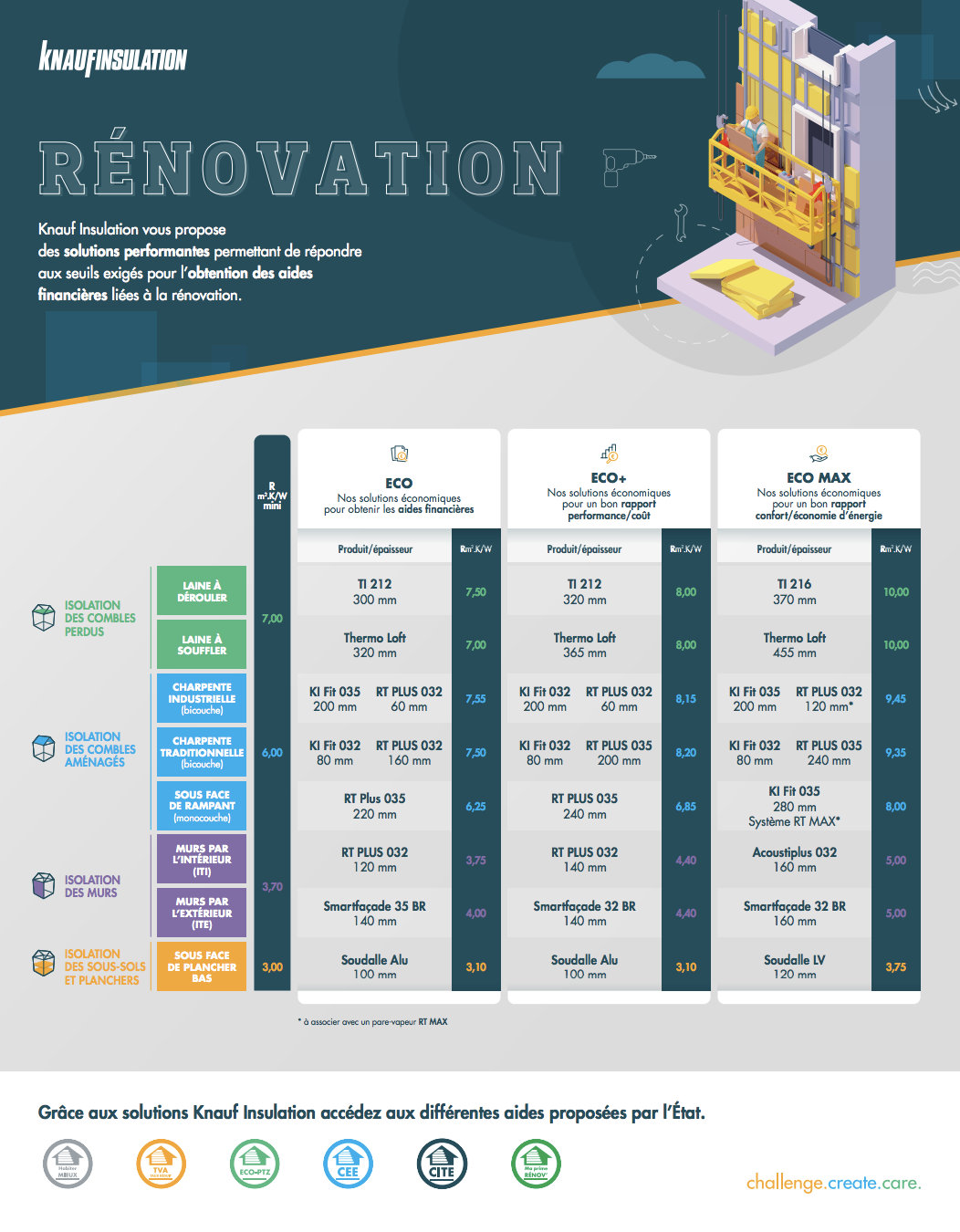 A votre disposition, un tableau répertoriant toutes les solutions d'isolation existantes, suivant le type de chantier. Éco, Éco +, Éco Max, vous trouverez à coup sûr le système le plus adapté.