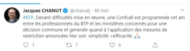 « Dans cette période compliquée, nous devons tous agir en responsabilité. Jusqu’à ce matin, le gouvernement indiquait que nos négoces et les chantiers peuvent poursuivre leur activité en se conformant strictement aux règles sanitaire et d’hygiène. Mais la FFB et la Capeb pourraient appeler les entreprises à des mesures plus radicales pour éviter tout risque pour les salariés. Nous restons en contact permanent avec ces organisations pour étudier l’évolution de la situation heure par heure », confie-t-il. Pour l’instant, le ministère du Travail n’a toujours pas donnée de consigne sur l’arrêt général des chantiers – à l’exception des interventions de dépannage et des urgences.