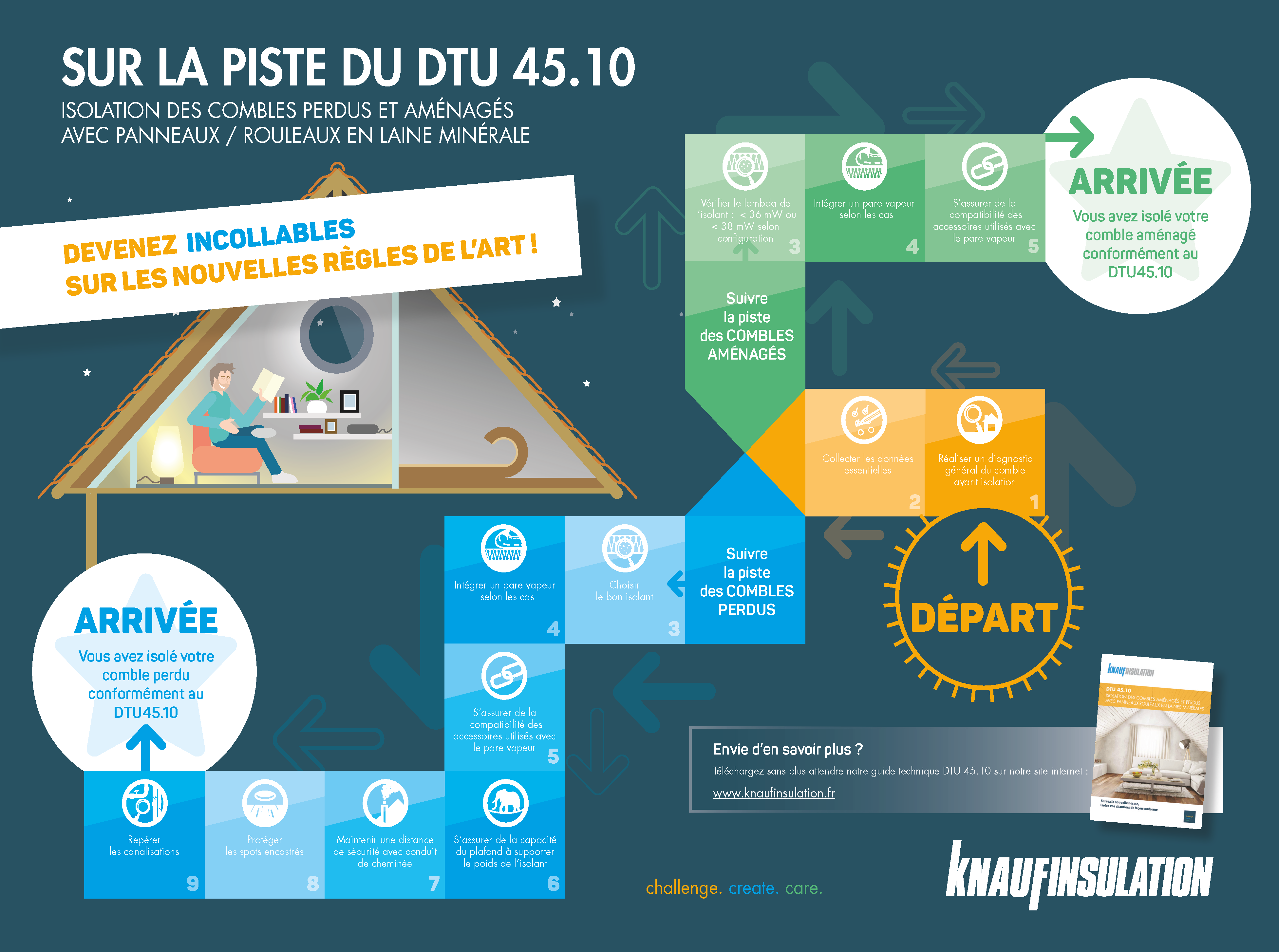 Le voici enfin disponible ! Et devinez quoi ? Nous vous proposons de le télécharger gratuitement ! Avec cet outil pratique, vous devenez incollable sur les nouvelles règles de l'art : nous répertorions pour vous les points clés à retenir, que ce soit en combles aménagés ou perdus et nous vous transmettons des préconisations produits suivant le profil de votre chantier.