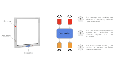 « Nous sommes en phase émergente seulement, à promouvoir le concept et démarrer le développement. Nous avons encore un peu de R&D », nous confie le co-fondateur. DeNoize espère que la solution sera totalement invisible des consommateurs finaux. Il nous révèle son fonctionnement : « Des microphones ou capteurs de vibrations collectent des signaux extérieurs qui sont traités par de l’électronique. Cette intelligence commande des actionneurs qui exercent une force mécanique sur le vitrage pour produire un contre-bruit ». Le vitrage atténue ainsi les nuisances, à la manière d’un casque anti-bruit fréquent sur les chantiers. « On ne va pas dégrader les performances thermiques ou d’étanchéité du double vitrage », assure Olivier Schevin, qui ajoute que la technologie sera compatible autant avec des simples que des triples vitrages. En contact avec le vitrier Pilkington, la startup doit encore travailler sur les contraintes d’industrialisation de sa solution. Notamment de son alimentation électrique, puisque le système est actif : « Comme les stores, il faudra un câble électrique. Mais nous étudions les solutions de récupération d’énergie pour aller vers l’autonomie complète ». DeNoize serait notamment en contact avec une autre startup néerlandaise spécialisée dans le glanage énergétique.