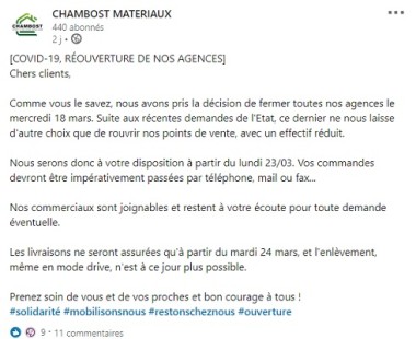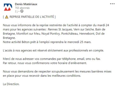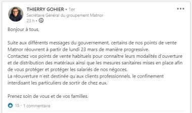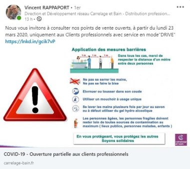 Combien de points de vente ont à nouveau levé le rideau ce matin dès 7h30 ou 8h00 ? En fin de semaine dernière, Franck Bernigaud, le président de la FNBM – la plus importante fédération du négoce Bâtiment qui représente environ 5 500 agences – estimait que « 40 % du réseau devaient pouvoir reprendre une activité dès le lundi 23 mars ». Seuls les sites jugés stratégiques sont en activité pour l’instant. Chez Legallais, par exemple, Philippe Nantermoz, mentionne « 6 agences ouvertes ce matin sur nos principales agences : Caen, Lyon, Paris-Saint Denis, Lille, Marseille et Mantes-Magnanville (78). Peut-être d'autres plus tard, mais nous attendons de voir la communication gouvernementale du début de semaine ». Dans un communiqué diffusé ce matin, Saint-Gobain indique que « certaines enseignes en France, qui se sont arrêtées quelques jours, reprennent progressivement leur activité ». Selon une information d’Europe 1 publiée vendredi 20 mars , en cours de soirée, « dès lundi matin, 40% des enseignes du groupe Saint Gobain, comme Point.P, ou encore Cédéo, rouvriront leurs portes dès 8 heures ». Avec un accès réservé aux seuls professionnels du BTP. Chez Gedimat, des adhérents d’Algorel comme FIC sur la région de Montpellier, le lyonnais BigMat Girardon, le breton Denis Matériaux, Matnor, Chambost ou encore Carrelage & Bain, la reprise s’étale entre aujourd’hui et mardi 24 mars. Un report d’une journée que certains distributeurs justifient pour adapter la sécurité des agences et les conditions d’accès, mais aussi former les équipes à des conditions drastiques de réouverture. De son côté, le Groupe Samse qui, à son tour, expédie aujourd’hui 10 000 masques FFP2 aux quatre CHU de Mulhouse, Dijon, Grenoble et Perpignan, organise jeudi 26 mars un webinar « pour échanger autour du télétravail et de la situation » actuelle. Un moyen d’aider les équipes et professionnels confinés à « passer de la sidération à l'action ».