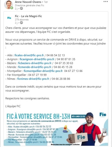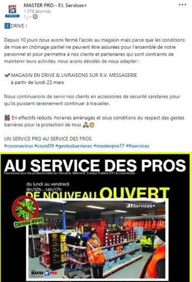 • l’organisation du travail des équipes en mode restreint en respectant là encore la distance de 1 m à chaque étape (remise de la facture, règlement sur place par CB uniquement…).