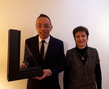 EN PHOTO • Manech Dillinger (directeur produits menuiserie) et Marie Bourselot (chargée de la communication) présentent l'ouvrant Aluméa « conçu dans un esprit architectural » qui affiche un Uw de 1,5.