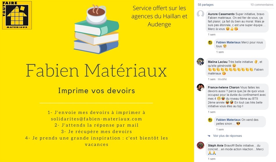 • 21 mars • Réouverture partielle (4 sites sur 5 fermés depuis le 17-03) et horaires aménagés par agence. Pour informer dans le détail les clients sur cette nouvelle organisation, une adresse mail spécifique est créée : crise@fabien-materiaux.com