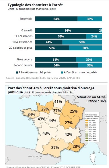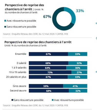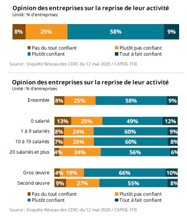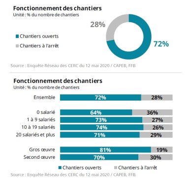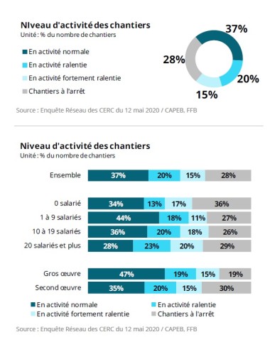 *(A la demande de la Capeb et de la FFB, le réseau des CERC assure un suivi hebdomadaire de l'activité. L'étude présentée a été menée du 12 au 14 mai 2020 auprès de 1 416 entreprises du Bâtiment, intervenant sur 12 278 chantiers.)