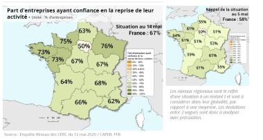 La situation a sans doute évolué depuis, mais l'étude réalisée par le réseau des CERC* arrêtée au 14 mai donne déjà des premières indications sur la reprise des chantiers. Une progression constante qui s'accompagne d'un retour à un peu plus d'optimisme sur l'activité des prochains mois : 67 % des chefs d'entreprises ont confiance en la reprise de leur activité contre 58 % le 5 mai. L'étude cerne aussi toutefois les conditions dans lesquelles se déroule l'activité et les obstacles persistants.