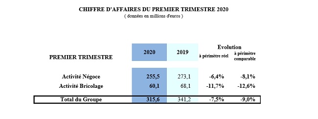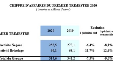 Patatras également pour les 37 magasins L’Entrepôt du Bricolage. Avec un chiffre d’affaires de 60,1 M€ au premier trimestre, le pôle GSB du groupe a fléchi de -11,7 % en données réelles et de -12,6 % à champ constant. Sur le seul mois de mars, l'activité Bricolage a en effet plongé de -47,4 % (vs -49,48 % en CA et -49,64 % en volume pour l'indice FMB). Là aussi, « jusqu’au début du confinement, la progression de l’activité était soutenue avec +9,8 % par rapport à 2019 en cumul à fin février », précise le communiqué. Logiquement fermés lors de la première “semaine Covid”, l’enseigne avait repris, elle aussi, une activité partielle en assurant « uniquement » les “livraisons drive” sur commande et prise de rendez-vous en ligne au préalable. Ce mode opératoire s’est étalé « progressivement » pour être adopté par une vingtaine de magasins fin mars.