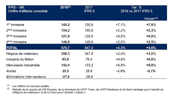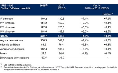 Sur l’ensemble de l’exercice 2018, Hérige a enregistré un CA total (à 570,7 M€) en hausse de 4,6 % (à périmètre comparable). Le réseau VM a réussi à faire preuve de résilience. A périmètre comparable, l’évolution de l’activité des négoces du groupe s’est affichée « en hausse de 3,0 % (à périmètre comparable), bien que les mises en chantiers des logements individuels soient en baisse de 4,5 % sur 12 mois », précise Hérige dans un communiqué. En revanche, ses deux activités industrielles restent sur des niveaux d’activité soutenus : la branche béton (à +9,8 %) a été « notamment tirée par l’augmentation de volumes de béton prêt-à-l’emploi » ; tandis que l’activité menuiserie industrielle ressort en croissance de 6,9 % « toujours dynamisée par son nouveau produit AM-X » qui développe désormais une logique d’offre globale. « Dans un marché de la construction fragile », le groupe Hérige indique néanmoins resté « confiant dans ses fondamentaux, sa capacité d'adaptation et sa politique de gestion rigoureuse ».